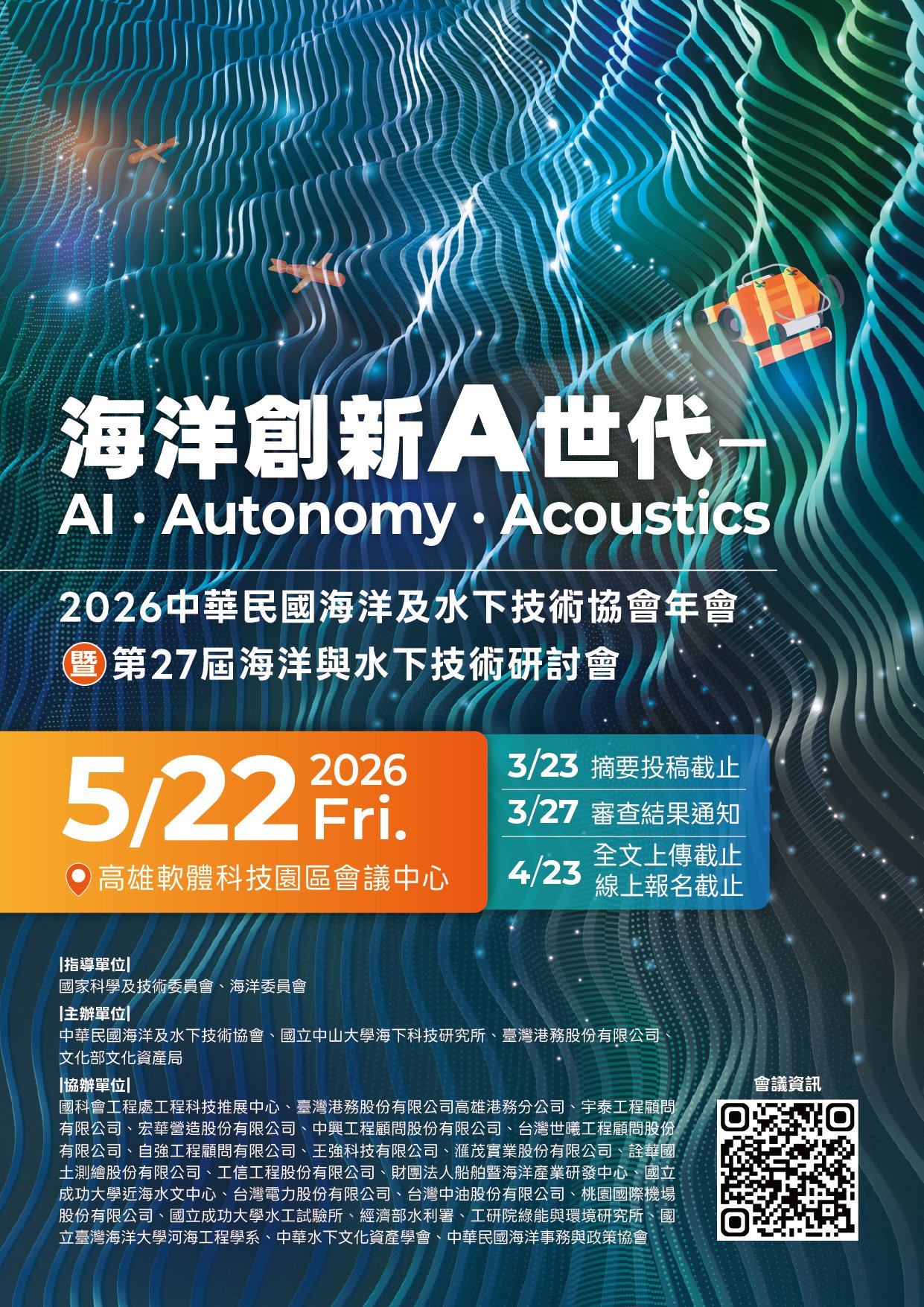 2026中華民國海洋及水下技術協會年 會暨第27屆海洋與水下技術研討會 海洋創新 A 世代 — AI.Autonomy.Acoustics 查看更多 主題:海洋創新A世代-AI•Autonomy•Acoustics 本研討會以「海洋創新A世代-AI.Autonomy.Acoustics」為主題,延續歷屆研討會對海洋與水下技術之關注,並聚焦於新一世代智慧化、系統化與感知導向之海洋科技發展趨勢。隨著人工智慧、水中聲學與系統行為能力的快速進展,海洋科技正逐步從單一技術或設備導向,邁向跨感測、跨平台與跨自主層級之整合應用。本次研討會旨在探討AI技術於海洋感知與分析中的角色、水中聲學於感測、成像與通訊之關鍵地位,以及自主系統行為在遠端操控、半自主與自主海洋系統中的實踐與挑戰。會議內容將涵蓋傳統水下技術與新興智慧科技之整合應用,並關注其於海洋觀測、文化資產調查、海洋能源、生態保育以及永續發展等面向之實務需求。期盼透過產官學研之交流,促進新一代海洋科技的研發與應用,為未來海洋探索與管理奠定技術基礎。